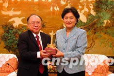 八月二十六日,全國政協(xié)副主席、中共中央統(tǒng)戰(zhàn)部部長劉延東(右)在北京會見了以廖長城為團長的香港律師界訪京團。中新社記者:盛佳鵬