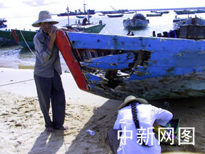 中新社?诎嗽露针(記者關(guān)向東王辛莉通訊員余茂生)海口新海村漁民陳家位,一臉疲憊地依在剛打撈出水的自家漁船船頭,船頭左側(cè)一大洞,后艙甲板翻倒在沙灘上,兩年前花七萬元人民幣造的漁船因一場臺風轉(zhuǎn)眼間散架成一堆廢木。