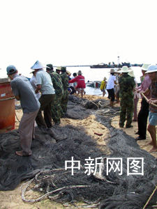 記者在現(xiàn)場看到:海南省海事局派出打撈船在緊張作業(yè),來自駐地的海軍潛水員忙著幫漁民將纜繩系上水底的漁船,而秀英區(qū)武裝部的戰(zhàn)士與當?shù)氐母刹、村民一道拉纜,將剛剛出水的船只拖上岸。