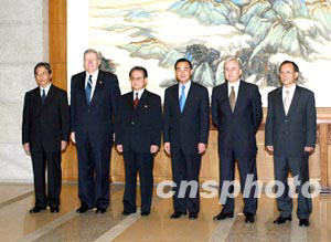 在會談開始以前,參加北京六方會談的各方代表團團長在釣魚臺國賓館芳菲苑大廳前集體亮相與各路媒體記者見面,他們的順序從左到右依次是日本外務省亞大局局長藪中三十二、美國助理國務卿凱利、朝鮮外務省副相金永日、中國外交部副部長王毅、俄羅斯副外長洛休科夫和韓國外交通商部次官補(長官助理)李秀赫。