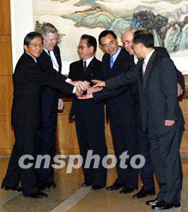亮相之后,出現(xiàn)了一個很感染人的場面,朝鮮代表團團長、朝鮮外務省副相金永日的雙手與其他五國代表團團長的手緊緊握在一起,微笑的金永日在這些人里面尤為顯眼。這樣的場景給予了關注六方會談的人們和平解決朝核問題的期望。