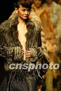中國當(dāng)代六位最優(yōu)秀的時裝設(shè)計師,今秋十月十三日將在法國巴黎時裝周上展示新作,中國最優(yōu)秀的十名模特為她們表演極具東方魅力的中華時尚服飾。圖為中國設(shè)計師武學(xué)凱的皮草新作。中新社記者:賈國榮