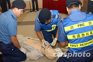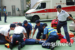 香港消防處,九月五日舉行先遣急救員計劃演練,在救護員尚未抵達事故現(xiàn)場時,為傷病者先行提供基本維生術。圖為消防先遣急救員進行演練。中新社記者:錢興強