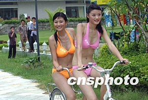 經(jīng)過幾天在海南三亞的賽前培訓(xùn),九月十日,參加2003年新絲路中國模特大賽的五十一名佳麗到海灘上放松心情,舒緩大賽前的緊張氣氛。中新社記者:盛佳鵬