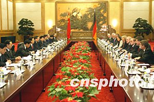 中國國家主席胡錦濤十一日在北京人民大會堂與來訪的德國總統(tǒng)約翰內斯·勞舉行會談。中新社記者:毛建軍