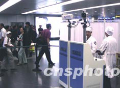 北京首都國際機場九月下旬重啟防非典監(jiān)察臺,醫(yī)護(hù)人員在乘客入口處的體溫自動監(jiān)測儀后值班,嚴(yán)防即將到來的黃金假期千千萬萬人流中發(fā)生疫情。中新社記者:賈國榮