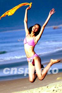 參加第五十三屆世界小姐中國(guó)總決賽的選手身著泳裝十八日在三亞亞龍灣進(jìn)行外景拍攝,一名受過藝術(shù)體操訓(xùn)練的選手做出迷人姿態(tài)展翅欲飛。中新社記者:毛建軍