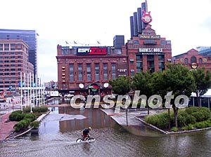 九月,“伊莎貝爾”颶風(fēng)帶來的強(qiáng)暴雨和大風(fēng)浪,令美國東部一些沿海城市積澇成災(zāi)。馬里蘭最大海濱城市巴爾的摩的旅游景點(diǎn)內(nèi)灣地區(qū)一片澤國,騎車人涉水而行。中新社記者:余東暉