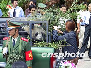中午二時(shí)許,八只國(guó)寶大熊貓抵達(dá)雅安碧峰峽研究基地,藏漢民眾和碧峰峽研究基地的工作人員手持鮮花、彩旗隆重夾道歡迎國(guó)寶平安抵達(dá)。歡迎儀式結(jié)束之后,八臺(tái)大熊貓專車往新居行近,武警戰(zhàn)士將這八只大熊貓?zhí)нM(jìn)了它們的“豪華別墅”。這八只大熊貓忽閃忽閃的眼神,顯示著它們的新奇與不安。畢竟這是一個(gè)陌生的世界。大熊貓遷入新居時(shí),一些大熊貓發(fā)怪叫聲,有的在房里轉(zhuǎn)來(lái)轉(zhuǎn)去,但是,當(dāng)護(hù)養(yǎng)人員將竹子、蘋(píng)果送給它們吃時(shí),即刻恢復(fù)了常態(tài)。