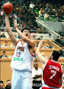 在全場觀眾的期待中,姚明首發(fā)出場,與張勁松、李可、朱芳雨、劉煒攜手上陣。緊逼防守和快速的反擊屢屢奏效,小巨人幾次漂亮的扣籃和蓋帽更是贏得滿場喝彩。相比之下,敘利亞隊(duì)顯得畏手畏腳,過于保守,完全沒有了上屆亞錦賽歷史性地打入四強(qiáng)的斗志。僅第一節(jié)比賽,中國隊(duì)就以三十二比九遙遙領(lǐng)先,姚明獨(dú)得十二分。