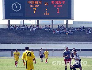 正在廣東湛江訪問的美艦官兵與中國海軍南海艦隊(duì)的官兵二十五日上午在湛江市體育中心舉行了一場別開生面的足球友誼賽,最后,中國海軍隊(duì)以七比一的大比分獲勝。作者:李小軍