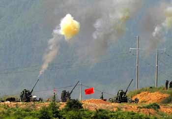 突然,煙霧彈、錫箔干擾彈等在上空散開(kāi),此時(shí),民兵預(yù)備役官兵們?cè)缫逊植荚诓煌恢,?shí)施對(duì)空射擊。隨著震耳欲聾的“轟隆”聲,一團(tuán)團(tuán)煙霧驟然從地面騰空而起,糧庫(kù)、公路、油庫(kù)及居民房成了一片火海,整個(gè)演練場(chǎng)上硝煙彌漫。