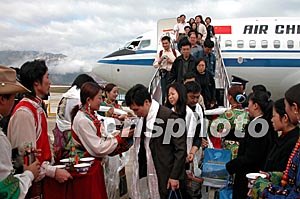 28日上午8點(diǎn)40分,104名來自全國各地的游客搭乘國航西南公司5027號(hào)波音737—600客機(jī)經(jīng)過45分鐘的飛行順利抵達(dá)九寨黃龍機(jī)場,宣告九寨航線正式通航。圖為當(dāng)?shù)夭刈迕癖姭I(xiàn)上青稞酒和哈達(dá),迎接來自各地的首航游客。作者:易世忠