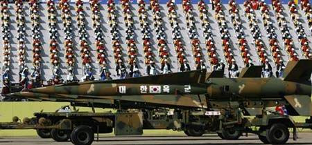 這次閱兵式展出了大型高科技武器,其中包括法制便攜式導彈、韓國國產巡航導彈、防區(qū)外發(fā)射的AGM-142空對地導彈。由以色列設計的這種被稱作“瞪眼”的導彈是韓國加強軍力計劃的一部分,這是這種導彈首次公開展示,這種由電子光學制導的導彈的射程超過100公里,于去年開始在韓國軍隊中服役。軍事官員稱,韓國將于今明兩年購買更多的這種導彈。
