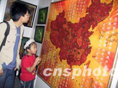 第六屆北京國際藝術(shù)博覽會(huì)“十一”黃金周期間在北京舉行。博覽會(huì)展出中外藝術(shù)家作品共一萬多件,圖為一幅由2001枚毛主席像章拼成的中國版圖油畫。中新社記者:張勤