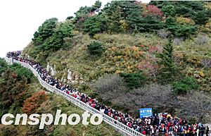“十一”長假期間,山東泰山風景區(qū)游客如云。圖為泰山頂上等候空中纜車的數(shù)百米長龍。中新社記者:王麗南