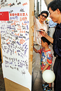 一位與父母剛逛完街預(yù)備回家的9歲男童施俊匡,在祝?埳虾灻С旨白8:教靻T。而爸爸施先生亦認(rèn)同,中國(guó)載人宇宙飛船升空是中國(guó)人的驕傲,因此希望簽名送上一點(diǎn)祝福。