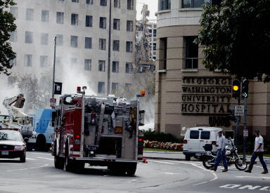 發(fā)生大火的街道位于喬治·華盛頓大學(xué)醫(yī)院的新樓和舊樓之間,距離白宮不到一公里。大火發(fā)生后,這家醫(yī)院的工作人員疏散了非急需的工作人員和來訪者,并把重點護理病人轉(zhuǎn)移到離大火最遠一側(cè)的病房。