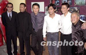 港產(chǎn)電影《無間道Ⅲ終極無間》10月9日在香港特別安排傳媒采訪探班,曾志偉、劉德華、梁朝偉、黎明、陳道明、黃秋生(右起)六大影帝聚首一堂。中新社記者:鄧慶樂