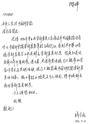 錢學森1955年回國,1957年被增選為中國科學院學部委員(1994年改稱中國科學院院士)。錢老當然十分珍視中國科學界給他的這一榮譽,并積極參加中國科學院學部委員的各種學術(shù)活動。但到晚年,當他行走困難,不便參加學術(shù)活動以后,便給當時的中國科學院院長周光召寫信,主動申請辭去學部委員的稱號(錢老給周光召的信附后)。