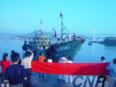中新網(wǎng)10月11日電 據(jù)中廣網(wǎng)報(bào)道,10月11日早晨7點(diǎn),搭載兩岸三地首次攜手保釣行動(dòng)10名勇士的“閩龍漁F861”號(hào)船安全返回廈門東渡漁港。