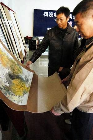 據(jù)遼寧省公物拍賣行有限公司債權(quán)部經(jīng)理董茂貴介紹,此次展出的拍品共有9大類、140余件。在展廳的對面,墻上懸掛著的16幅名家書畫特別惹眼,其中“瑞氣繞庭”、“成名何須頑石篆,路上行人口是碑”等幾幅字據(jù)說曾是慕綏新比較欣賞的,此時擺在展室里,卻成了對貪官絕好的諷刺。里間的櫥柜里擺放著手表、工藝品、書畫、相機等各種“名牌”貴重物品,很多都是沒有用過的。