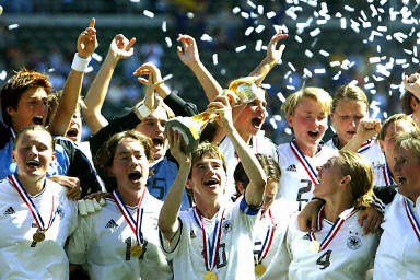北京時間今天凌晨3時許結(jié)束的第四屆女足世界杯決賽中,德國隊與瑞典隊在90分鐘的比賽中戰(zhàn)成了1-1平。在加時賽中,德國隊憑借著后衛(wèi)金策爾的一粒金球讓瑞典隊飲恨美利堅,他們也因此成為該項賽事的新科狀元。德國隊頭號射手普林茨奪取了金靴獎和金球獎兩項大獎。圖為德國隊員棒杯歡呼。
