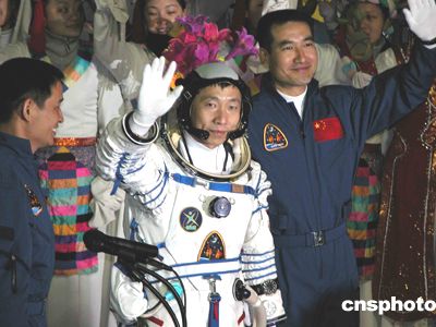 五時二十八分,循著這有些激動的聲音,只見身著乳白色航天服的首飛航天員楊利偉邁著從容而穩(wěn)健的步伐,從問天閣航天員的專用通道,微笑著向大家走來。緊隨他身后的是身著天藍色訓練服的航天員翟志剛和聶海勝。隨著歡快的《迎賓曲》奏起,航天員們被掌聲和鮮花包圍著。