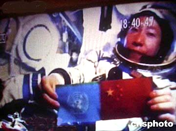 中國首位航天員楊利偉乘坐“神舟”五號飛船在太空飛行時展示聯(lián)合國旗幟與中國國旗。“神舟”五號飛船北京時間十月十六日六時二十三分在內蒙古中部地區(qū)成功著陸,中國首次載人航天飛行任務獲得圓滿成功。作者:賈國榮