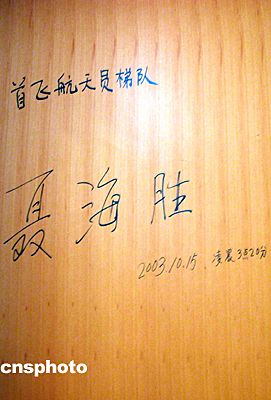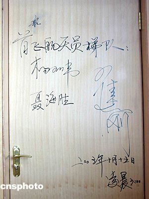 二00三年十月十五日凌晨,中國(guó)飛天第一人楊利偉及首飛梯隊(duì)航天員于“神舟”五號(hào)載人飛船發(fā)射前,在酒泉衛(wèi)星發(fā)射中心航天員公寓“問(wèn)天閣”的住房房門(mén)上簽名留念。中新社記者 孫自法 攝影報(bào)道