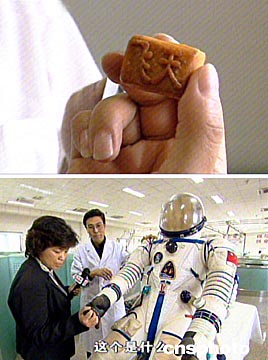 16日,北京新聞媒體記者在中國首次載人航天飛行取得圓滿成功之時(shí)參觀北京航天城,觀看中國自制的航天服和具有中國特色的航天食品——特制飛天月餅。中新社圖
