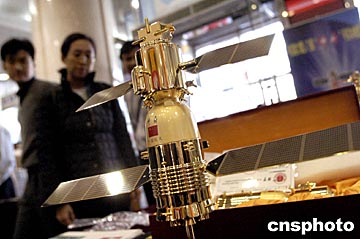 中國(guó)載人航天飛船“神舟”五號(hào)發(fā)射和回收取得圓滿成功后,北京王府井新華書(shū)店門口安放了制作精美的“神舟”五號(hào)實(shí)體模型,以標(biāo)價(jià)1000元人民幣進(jìn)行出售。中新社記者:鄒憲