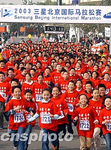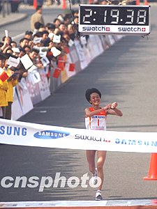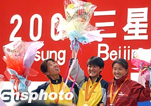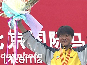 前不久在法國巴黎世界田徑錦標(biāo)賽上取得一枚銅牌的孫英杰是二00三年三星北京國際馬拉松賽女子組唯一的奪冠“大熱門”。在比賽過程中,孫英杰始終處于領(lǐng)跑的第一集團之中,并于后半程脫穎而出,最終以二小時十九分三十九秒的成績輕松奪得女子組冠軍,創(chuàng)造北京國際馬拉松賽女子組歷史最好成績。