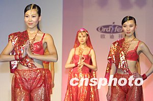 著名內(nèi)衣品牌歐迪芬,二十一日晚在上海舉行了一場“華夏文化內(nèi)衣秀”,推出多款具有民族風(fēng)情的新款內(nèi)衣,奪人眼球。中新社記者:湯彥俊