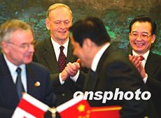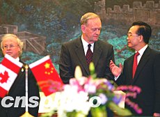 克雷蒂安贊同溫家寶對兩國關(guān)系的評價和提出的建議,他說,加中在各領(lǐng)域合作關(guān)系發(fā)展順利,兩國人民間的友誼不斷加深,加方對此感到滿意。加方希望雙邊貿(mào)易在今后七年內(nèi)再翻一番,期待與中方加強在能源、保險、環(huán)保、農(nóng)業(yè)等領(lǐng)域的合作,也歡迎更多中國人到加拿大旅游、留學。