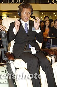 古天樂(lè)同場(chǎng)感受OSIM全球首張擁有音樂(lè)與按摩功能的音樂(lè)按摩椅。中新社記者:鄧慶樂(lè)