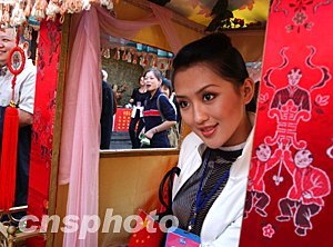 參加新絲路世界模特大賽的韓國小姐,十月三十日在杭州絲綢城采購,買到中國古代傳統(tǒng)女兒用的絲綢肚兜。中新社記者:賈國榮