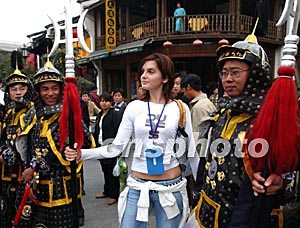 參加新絲路世界模特大賽的外國小姐,十月三十日游覽杭州河坊街時,扮作古代護城的中國武士。中新社記者:賈國榮