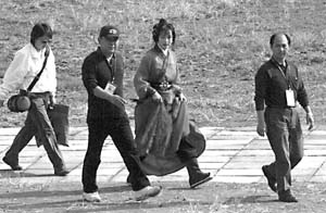 停車處與拍攝的大殿有幾百米距離,劉曉慶神態(tài)自若地與身邊人有說有笑。她看上去只有35歲上下,扮相頗像當(dāng)年的“武媚娘”。不少游客從她對(duì)面走過時(shí),都沒認(rèn)出她就是劉曉慶。兩名專門從東陽市保安服務(wù)公司聘請(qǐng)來的保鏢也無事可做,一路上幫著她的化妝師、助理拎包。直到走到大殿,劉曉慶發(fā)現(xiàn)早早埋伏的記者們舉著“長槍短炮”,立刻變了臉色。保鏢和助理立刻高舉雙手阻止拍照。劉曉慶進(jìn)殿后兩名保鏢把守住前后大門。