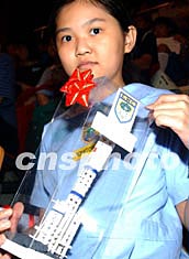 香港中、小學(xué)生與楊利偉及航天科學(xué)家11月3日在香港伊利莎白體育館舉行見面會(huì),一名小學(xué)生向楊利偉送禮品。 中新社記者:錢興強(qiáng)