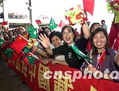 中國載人航天飛行代表團團長胡世祥、副團長張慶偉及航天員楊利偉一行在港澳碼頭受到了澳門各界人士的熱烈歡迎,中央駐澳聯(lián)絡(luò)辦主任白志健以及澳門特區(qū)政府代表、運輸工務(wù)司司長歐文龍等到碼頭迎接。近千名澳門中小學(xué)生和各大社團代表,打著橫幅、揮舞國旗和澳門區(qū)旗,夾道歡迎航天英雄的到來。當(dāng)楊利偉一行步出碼頭出境大廳時,人群中爆發(fā)出一陣陣歡呼聲。四名小學(xué)生向胡世祥、張慶偉、楊利偉和總設(shè)計師王永志獻花,楊利偉等向歡迎人群揮手致意,并不時同人們握手,感謝澳門同胞的盛情。