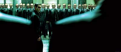 《革命》中,每個(gè)人都完成了自己的使命,崔妮蒂送尼奧去會見機(jī)器途中,看見空中絢麗的陽光時(shí),她完成了自己的使命;先知坐在那里靜靜地等待史密斯來升級時(shí),她也完成了她的使命;史密斯進(jìn)入尼奧的那一剎那時(shí),他完成了自己的使命,同時(shí)尼奧也完成了自己的使命,ok,好口羅嗦,其實(shí)還有很多……史密斯對尼奧說:“生命的目的就是結(jié)束!币苍S他到毀滅也不會明白他與尼奧的使命并不一樣,就看如何去選擇,他們都作出了自己的選擇。