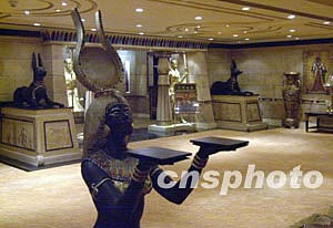五個貴賓廳總體風格設計是位于置地三樓的法老王宮殿娛樂場的延伸,但又各有特色!翱ㄩT皇殿”以埃及最富盛名的年輕法老圖坦卡門的皇殿為主題;“佩德拉皇殿”以埃及著名的皇后佩德拉其中一個私人行宮為主題;“大衛(wèi)皇殿”以大衛(wèi)王的私人居室為主題,表現(xiàn)非洲和阿拉伯的情調(diào);“所羅門皇殿”就以羅馬帝國經(jīng)典神殿為主題;“海神皇殿”表現(xiàn)羅馬神話中海神休閑的海底世界。每一貴賓廳的色調(diào)、燈光、壁畫、雕塑都予人出神入化的神秘感覺,令人仿如置身神話宮殿。