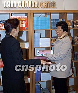 美東時(shí)間11月8日上午,中國(guó)國(guó)務(wù)院僑務(wù)辦公室主任陳玉杰(右)來(lái)到波士頓亞洲文化中心參觀(guān),并在那里與當(dāng)?shù)厝A僑華人代表舉行僑情座談會(huì)。圖為波士頓亞文中心主任魏晶向陳玉杰介紹情況。陳建 攝