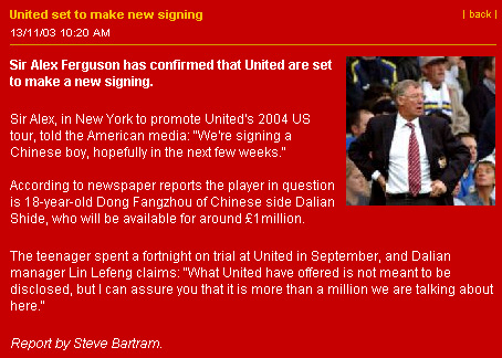 據(jù)曼聯(lián)隊(duì)官方網(wǎng)站透露,董方卓在今年9月份曾在曼聯(lián)隊(duì)試訓(xùn),其出色的表現(xiàn)也征服了包括弗格森在內(nèi)的曼聯(lián)俱樂(lè)部的管理層。