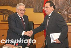 11月14日,中國國際戰(zhàn)略學(xué)會(huì)邀請(qǐng)美國前國務(wù)卿基辛格與中國軍方現(xiàn)職和退役將軍圍繞國際安全問題展開交流和討論。圖為解放軍副總參謀長、中國國際戰(zhàn)略學(xué)會(huì)會(huì)長熊光楷在座談會(huì)上與基辛格互贈(zèng)著作。中新社記者:張煒