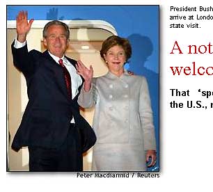 中新網(wǎng)11月19日電美國(guó)國(guó)家廣播公司倫敦報(bào)道,英國(guó)首相上周稱在歐洲正在興起“新的反美主義”,他說(shuō)對(duì)了,隨著今天布什的來(lái)訪,數(shù)千英國(guó)人用言語(yǔ)和行動(dòng)表示對(duì)布什的反對(duì)。