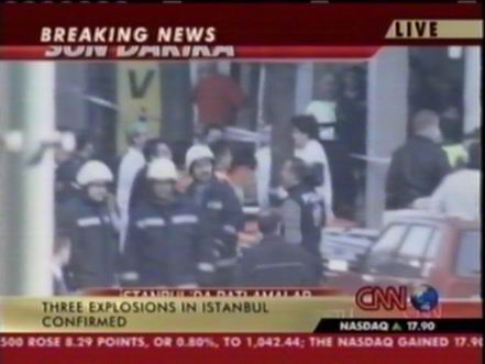 北京時間11月20日下午,位于土耳其伊斯坦布爾北部的土耳其匯豐銀行總部附近發(fā)生兩次爆炸,部分銀行建筑被摧毀。此后英國駐伊斯坦布爾領事館以及一個居民區(qū)和一座清真寺也遭到襲擊。圖為土耳其警察趕到爆炸現場。(春風)