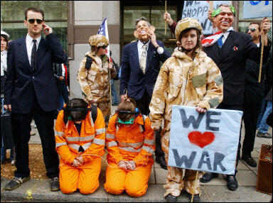 示威者裝扮成秘密警察(左)與關(guān)塔那摩囚犯