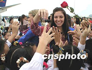 十一月二十二日,參加世界小姐二00三年總決賽的一百一十位世界小姐,乘座海航“國色天香”號專機(jī)機(jī)飛抵?诿捞m國際機(jī)場。即將代表中國參賽的關(guān)琦被前來歡迎的“小美女”們包圍。關(guān)向東 攝